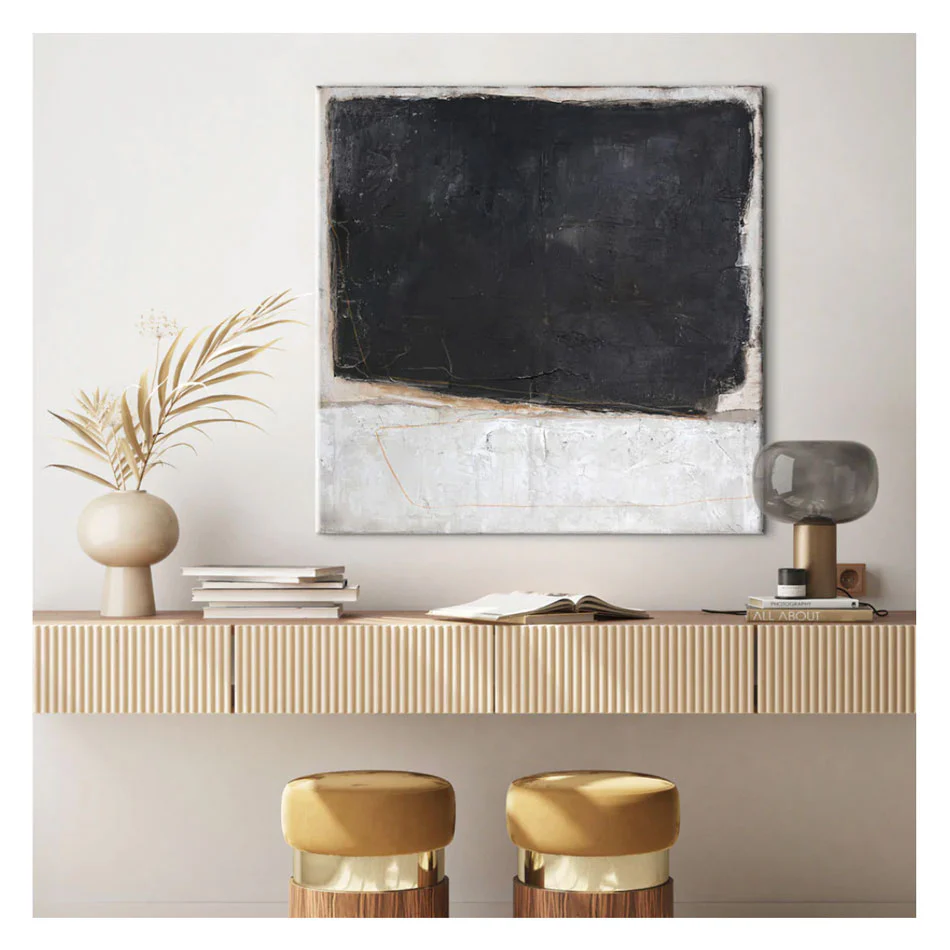 Blackout kännetecknas av läcker struktur och handmålade solida färgblock. Den strukturerade bakgrunden och graderingen i färgerna gör tavlan till ett framstående element att inreda med. Målningen passar med sin höga konstnärliga kvalitet och taktila touch perfekt i alla moderna hem. Tavlan finns med ekram och med svart ram.