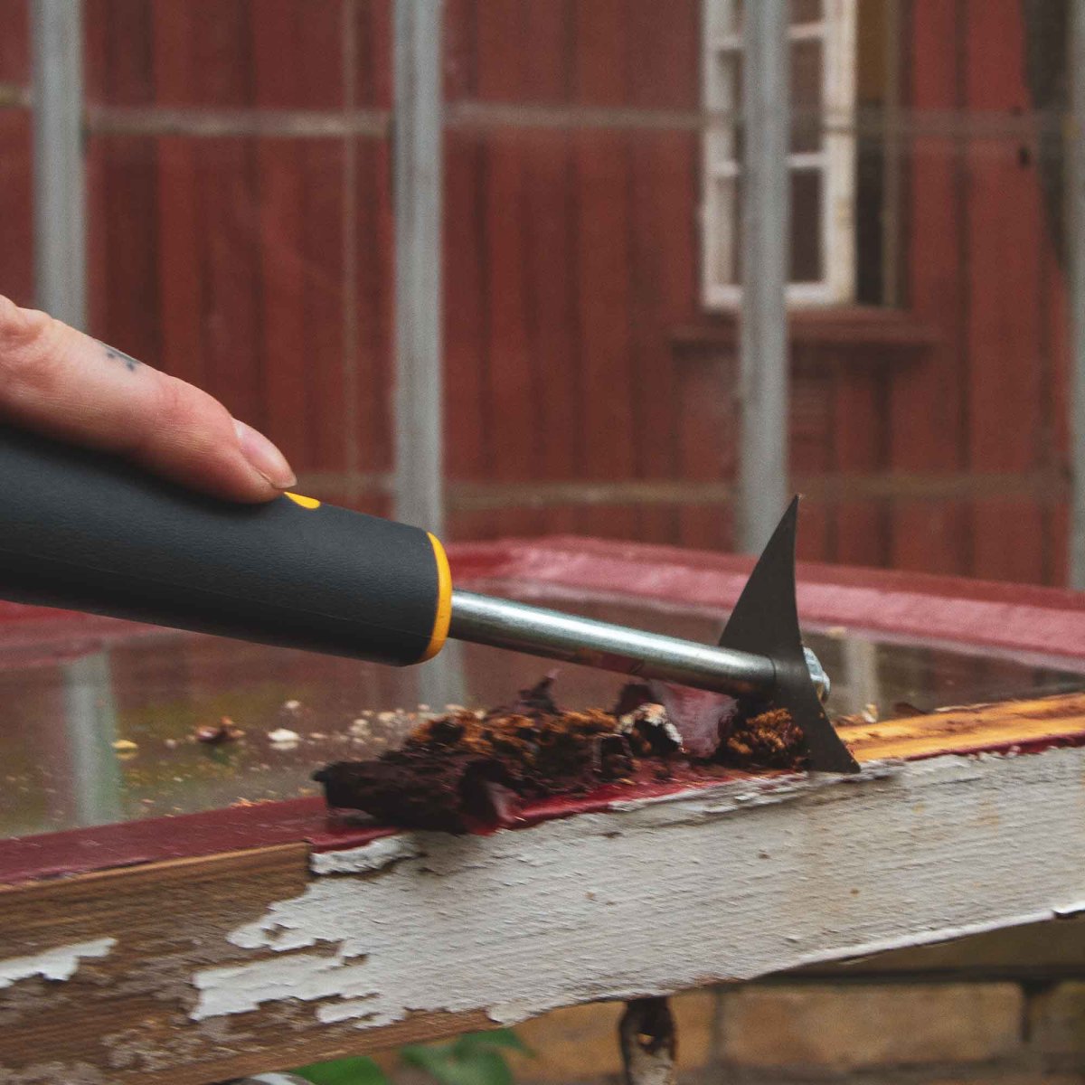 Bumerangskrapa – en högkvalitativ färgskrapa särskilt framtagen för finsnickerier och detaljerade ytor. Perfekt för fönsterbågar, lister, spegeldörrar och möbler där precision krävs.