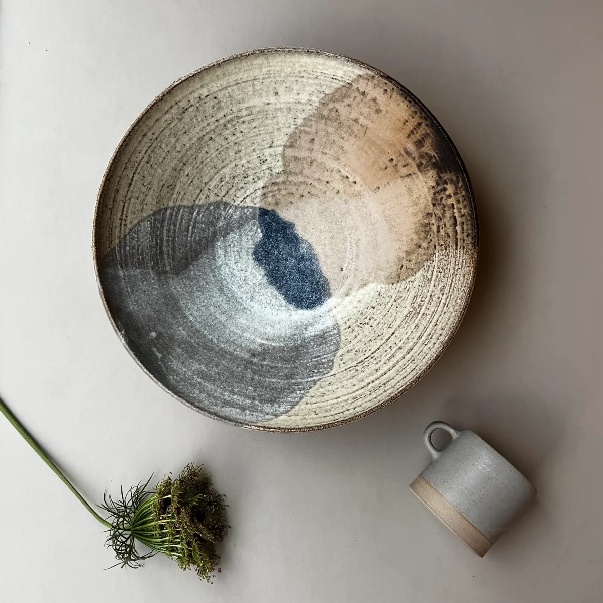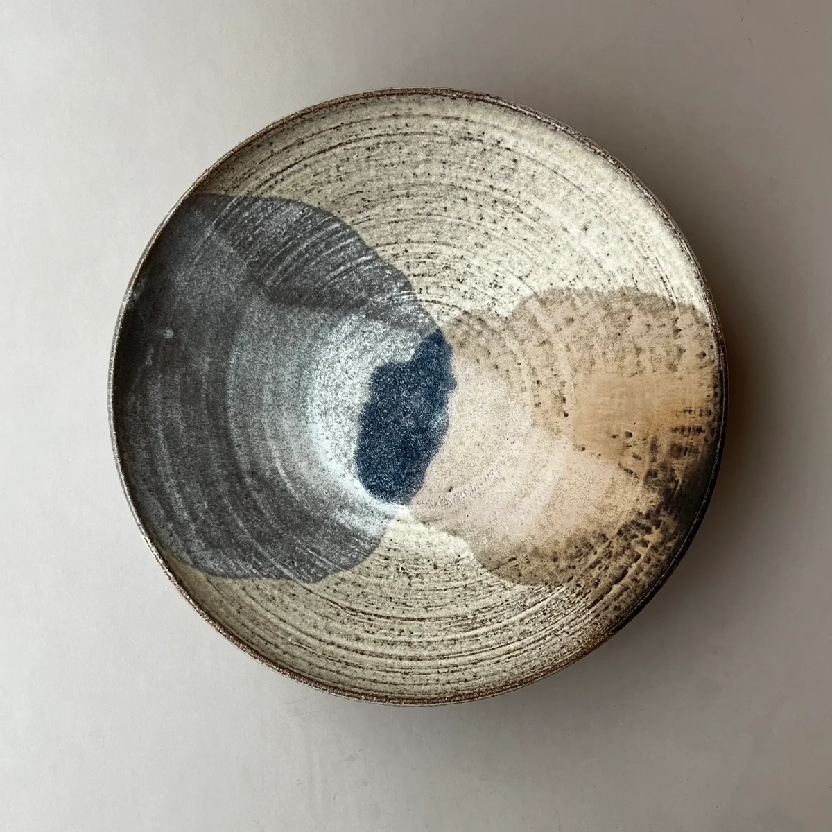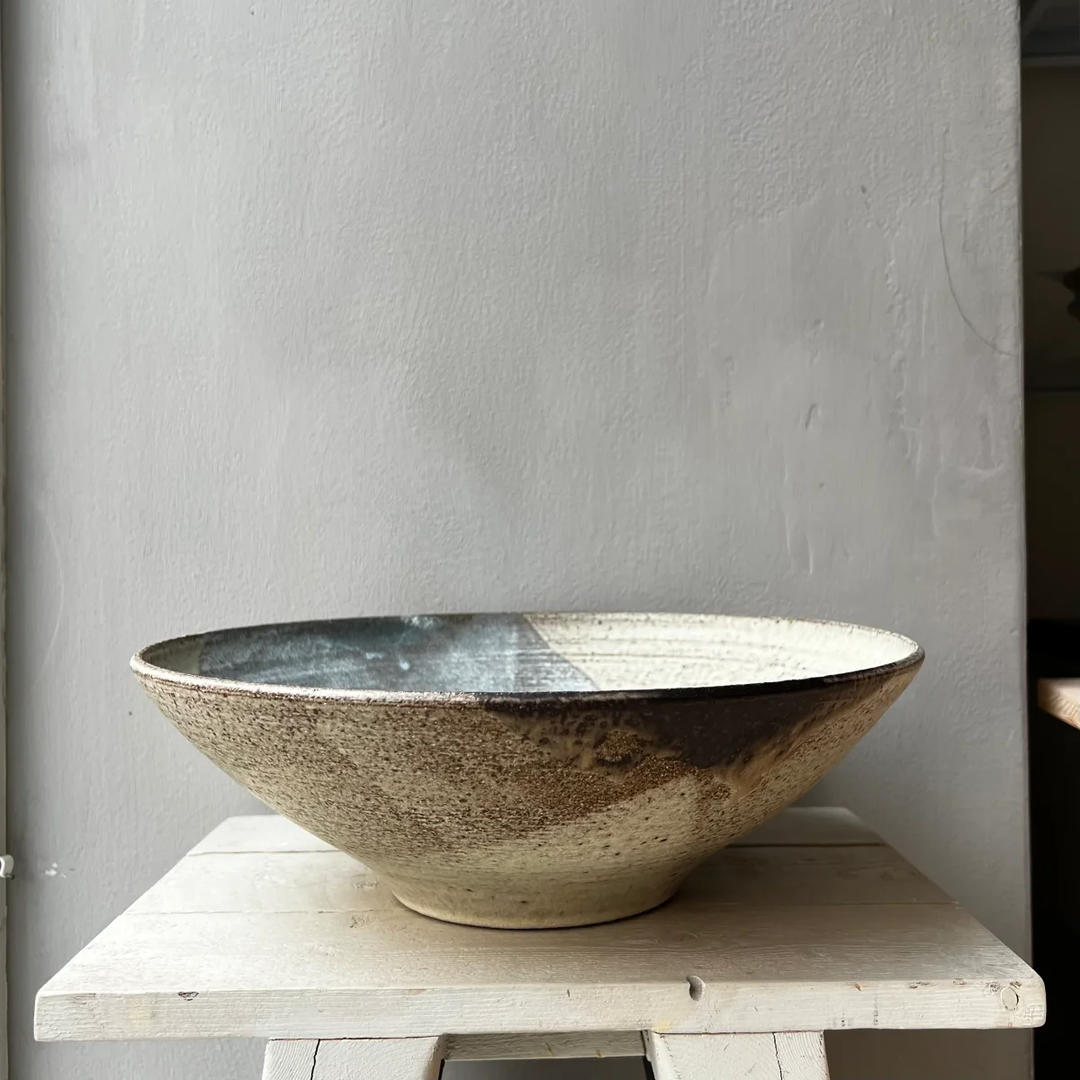En generöst stor skål, vacker att servera något i eller bara ha framme på bordet. Handdrejad i stengodslera med en kombination av glasyrer som skapar denna vackra sammansmältning.
