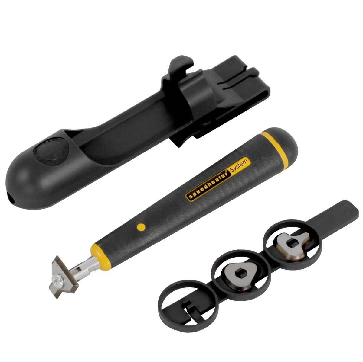 Levereras med tre skrapblad, bladmagasin och praktiskt hölster för smidig enhandshantering och enkel åtkomst under arbetet.