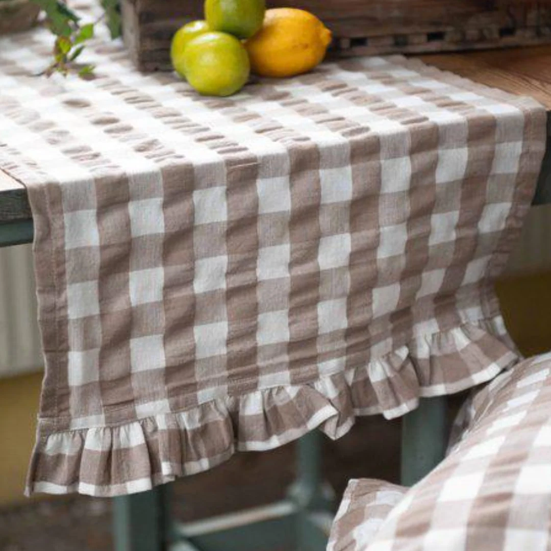 En vacker löpare i bäckebölja med volang på kortsidorna och ett klassiskt rutmönster. Denna eleganta detalj tillför en inbjudande och stilfull känsla till ditt matbord. Varumärke: Fondaco Material: 100 % Bomull Färg: Nougat Mått: 40×140 CM Kan tvättas i 40 grader.