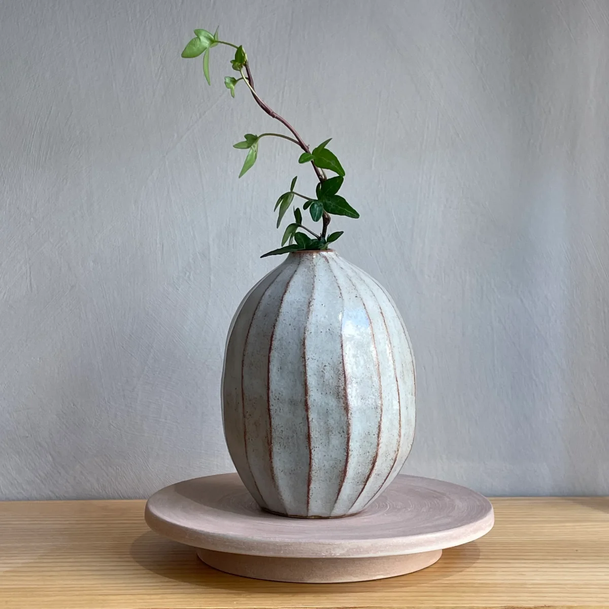 En handbyggd vas med vackra skiftningar och ett räfflat mönster som är har karvats fram för hand. En tidlös form som passar lika fint med snittblommor som som ett fristående objekt.