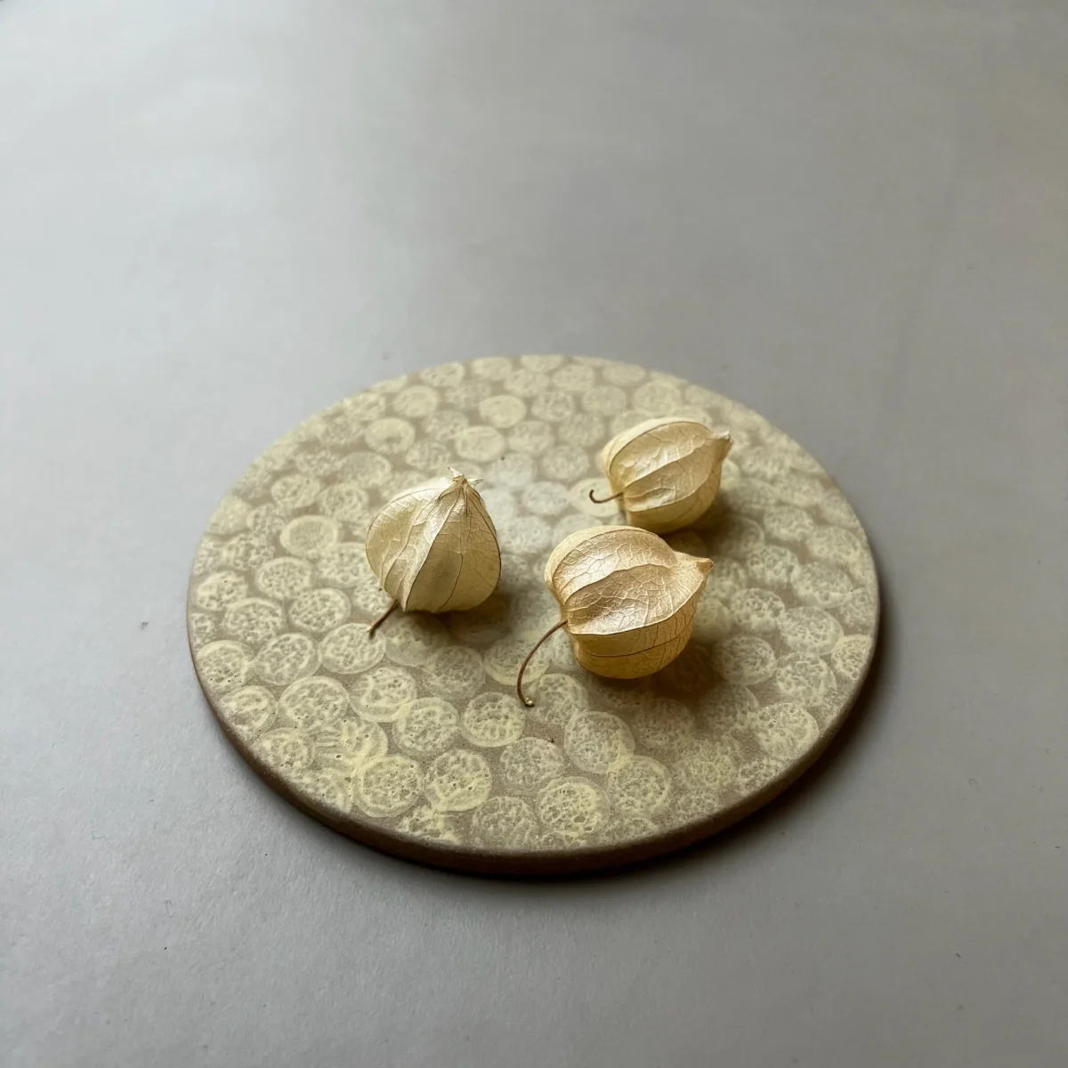 En handgjord unik keramikplatta i stengodslera. Plattan är formad för hand och dekorerad med ett upprepat, milt gult taktilt mönster som ger ytan liv och karaktär. Den handgjorda processen skapar små variationer i struktur och uttryck. Plattan passar lika bra som serveringsfat, underlägg eller dekorativ detalj i hemmet. Just de här plattan är målad med engobe (lerfärg) och behandlat för att stå emot fläckar. Behandlingen är “foodsafe”.